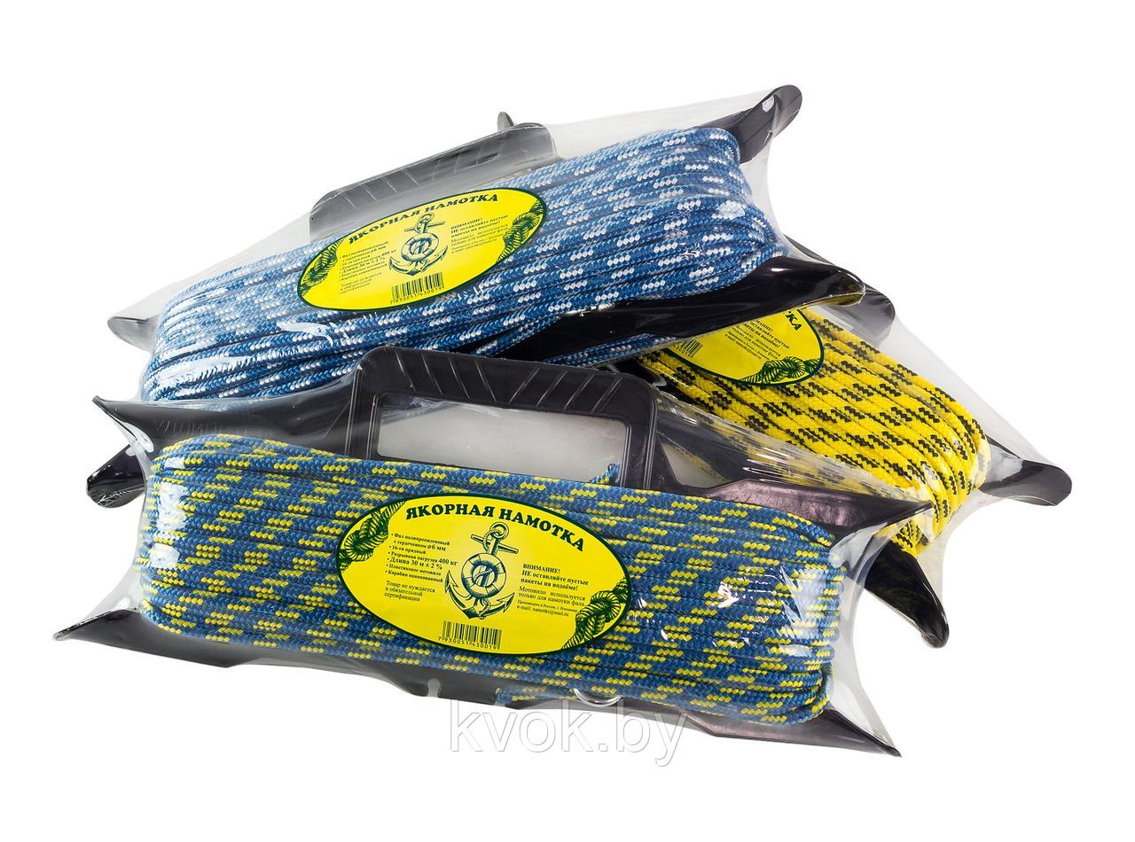 Якорная намотка состоит из полипропиленового фала с сердечником d 8 мм и длиной 20 м, карабина и пластикового мотовила с эргономичной ручкой. Не боится УФ излучения. Износостойкий. Легкий.
