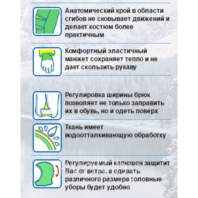 Зимний костюм Чайка Север отлично подойдёт для рыбалки или активного отдыха. Основным отличием является составляющая костюма «нейлон», что позволяет оставаться ткани мягкой на морозе.