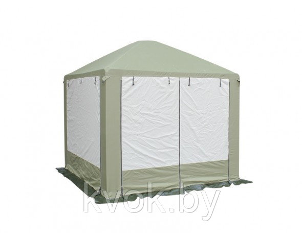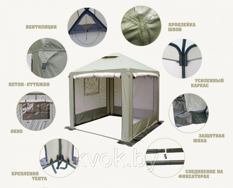Удобный сборно-разборный шатер-тент с противомоскитными сетками предназначен для защиты от грызунов, насекомых и неблагоприятной погоды, поэтому с успехом используется на отдыхе в природных условиях. Прочный каркас шатра изготовлен из стали, поэтому вся конструкция устойчива к ветру. Все части каркаса надежно фиксируются между собой. Тент сшит из ткани, пропитанной специальным водоотталкивающим средством (водоотталкивающая пропитка 2000 мм. водного столба). Все швы проклеены. Поэтому тент прекрасно защищает от дождя. Стропы с пряжками, а также молнии помогают хорошо натянуть тент. При необходимости можно поднять все стенки и зафиксировать.